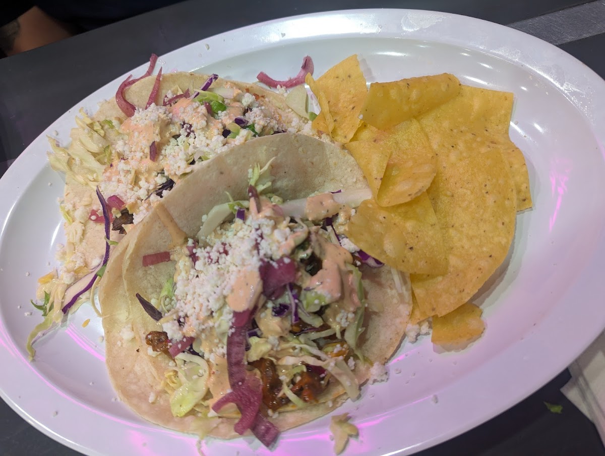 To Crispy Beef Tacos Rice and Beans and a Couple Chips